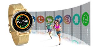 Smartwatch G.Rossi SW015-5 to elegancki zegarek damski, który łączy w sobie luksusowy design w kolorze złota z nowoczesną technologią i praktycznymi funkcjami. Dzięki bransolecie ze stali szlachetnej typu mesh będzie nie tylko funkcjonalnym urządzeniem, ale również wyjątkową ozdobą nadgarstka – idealną zarówno na co dzień, jak i na specjalne okazje.