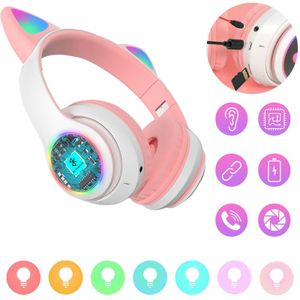 Słuchawki bezprzewodowe dla dzieci Bluetooth świecące LED RGB SD kot - biało różowe