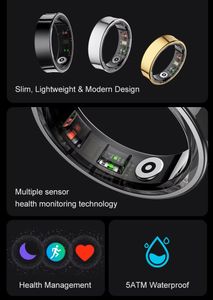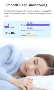 Elegancki inteligentny pierścień w kolorze srebrnym. Monitoruje kroki, kalorie, dystans, tętno, ciśnienie, natlenienie krwi, stres i sen. Ultralekki ok. 3,5 g, wodoodporność IP68, Bluetooth 5.2, aplikacja QRing dla iOS i Android. Czas pracy 3–5 dni, ładowanie około 1 h. Rozmiar 7 US: średnica 18,1 mm, obwód 56,9 mm, grubość 2,7 mm.